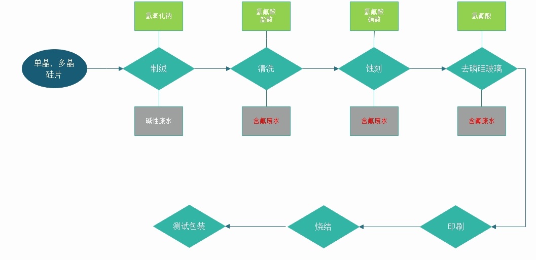 光伏行業含氟廢水主要來源于電池車間,電池車間的工藝為:制絨,擴散,濕法刻蝕,噴涂減反射膜,印刷燒結。其中硅片制絨和刻蝕兩個工序產生廢水,包括費酸液(硝酸+氫氟酸、氫氟酸+鹽酸或氫氟酸)、廢堿液、酸清洗水、堿清洗水。其中廢酸液和廢堿液水量較小,為間歇排放,酸清洗水和堿清洗水水量較大,水質相對穩定。其常見生產工藝為: