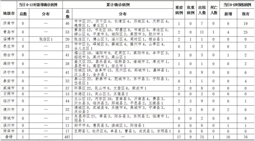 人民網濟南2月11日電 今日,記者從山東省衛生健康委員會了解到,2020年2月11日0-12時,山東省報告新型冠狀病毒肺炎新增確診病例1例,累計確診病例487例(含重癥病例17例,危重癥病例9例,治愈出院75例,死亡病例1例);新增疑似病例16例,現有疑似病例76例。截至目前,追蹤到密切接觸者13300人,已解除醫學觀察9735人,診斷為疑似或確診242例,尚有3323人正在接受醫學觀察。