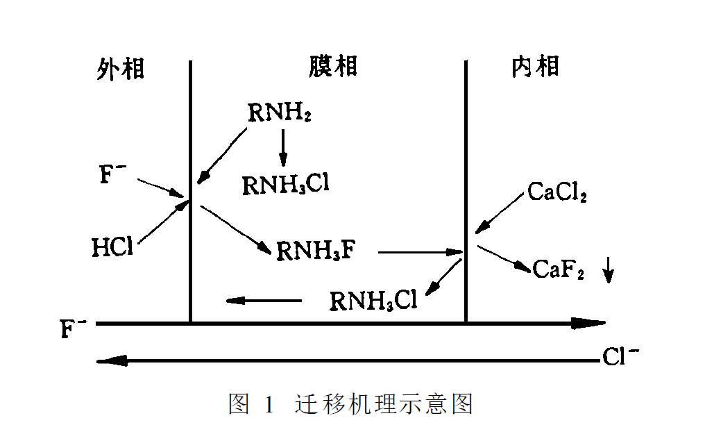 液膜法將溶液分成外相、膜相、內相三部分。其除氟機理是用膜相中適當的流動載體與廢水中外相的氟離子進行陰離子交換反應,然后帶有氟離子的流動載體再與內相中的試劑進行陰離子交換反應,交換出,形成難溶性氟化物從而達到去除氟的效果。