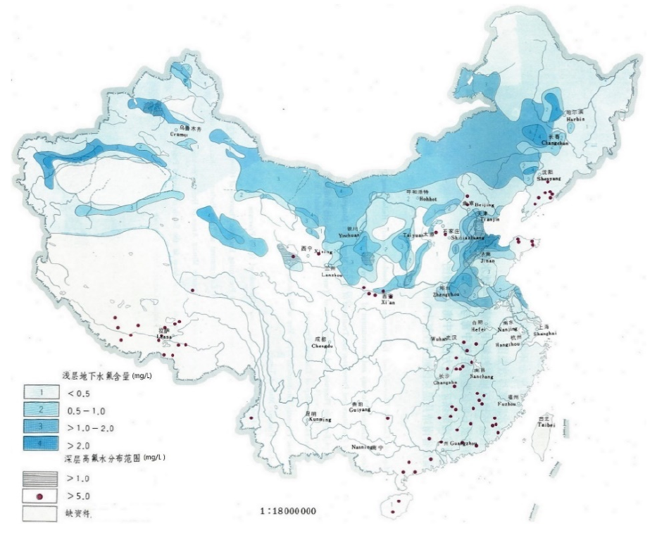 就世界范圍來看,幾乎沒有一個國家不受氟害之苦。如下圖所示,我國含氟地下水分布極廣,對于淺層地下水來說,高氟水問題比較突出的地域是華北地區(qū)、內(nèi)蒙古地區(qū)、西北五省的部分地區(qū)以及東三省某些地區(qū),基本上都集中在北方地域,對于南方地表水資源較充足的省份,高氟飲用水問題并不突出。
