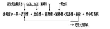 半導體行業進入中國后,給中國帶來了巨大的經濟利益,刺激了中國對于半導體產業的需求,但是它同時帶給中國的環境問題是不同忽視的。半導體行業在進行生產的過程中,會產生大量的廢水。其中含氟廢水對于環境的影響最大,危害也愈加嚴重,因此含氟廢水的處理在半導體生產過程中是必不可少的環節。半導體行業的含氟廢水處理常采用的方法為化學沉淀法和混凝劑沉降法兩種,無論是哪種除氟的方法,都需要進行除氟工藝的優化,才能有效提高除氟水平。以下將兩種除氟方法進行組合,形成氟化鈣絮凝沉淀法,使用化學沉淀法進行含氟廢水的處理原理可以用以下化學方程式來體現:Ca 2+ +2F - =CaF 2 ↓加入的 CaCl 2 是過量的,在加入之前為了保證 pH 值為8左右,因此還需要加入NaOH,然后加入絮凝劑,讓形成的沉淀 CaF 2成為礬花,從而更加有利于分離。加入絮凝劑后,含氟廢水會發生絮凝反應,之后,通過泥水分離方法,含氟沉淀很快分離出來,被污泥泵抽到污泥濃縮池中,最后用壓濾機壓成泥餅,而分離出來的上清液則進入中和池,經過再度監測后便可進行排放。檢查的水質不合格的需要進行二次處理,直到合格后方可排出。廢水排放的形式為連續排放,每次排放量為 480t/d。通過上述的原理分析,本半導體企業在進行含氟廢水的處理過程中,按照以下的除氟工藝流程來進行含氟廢水的處理。