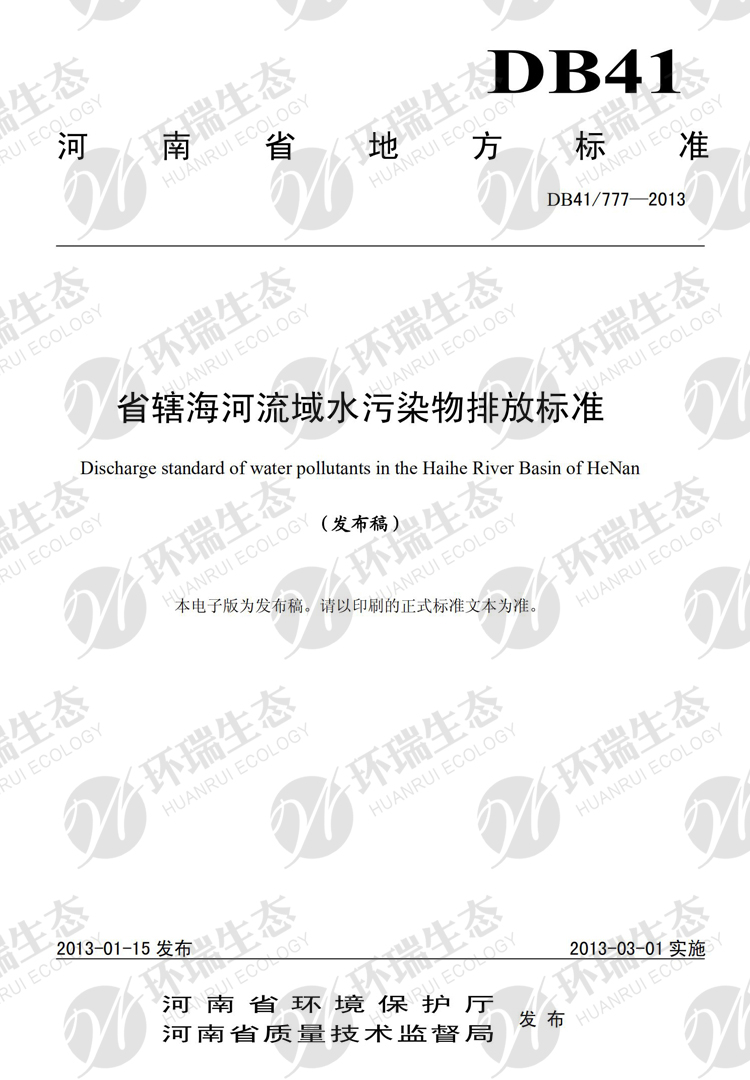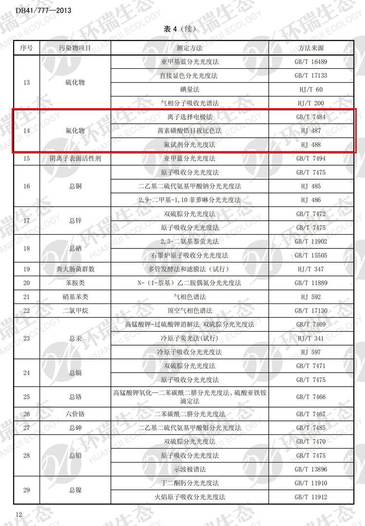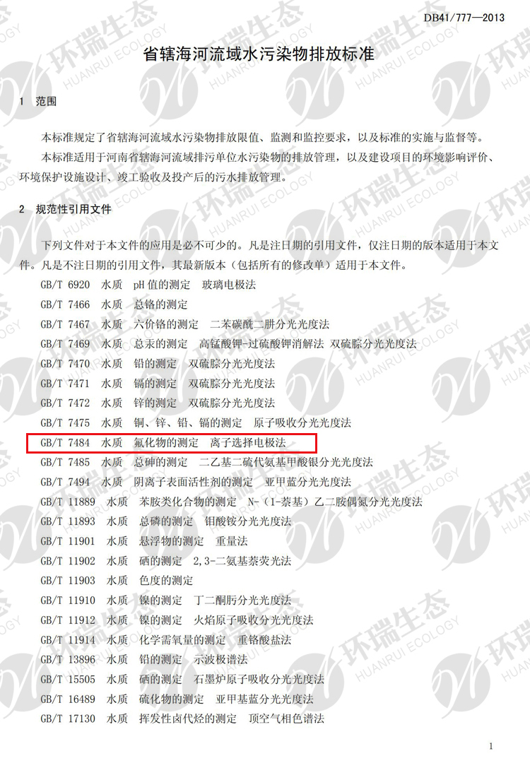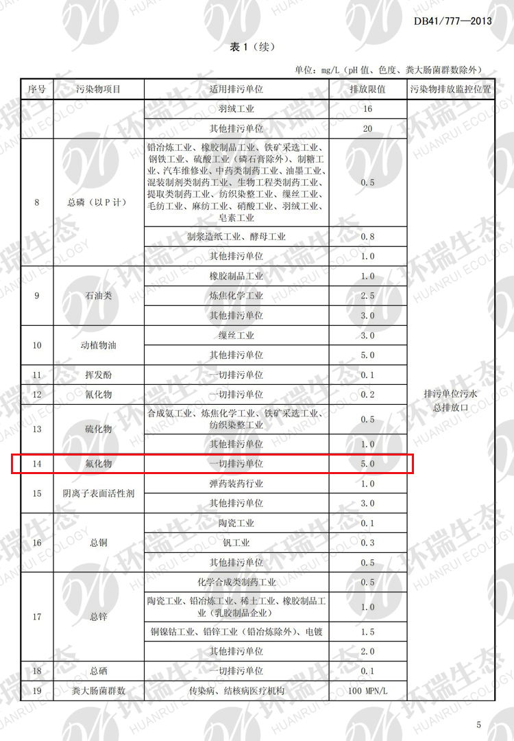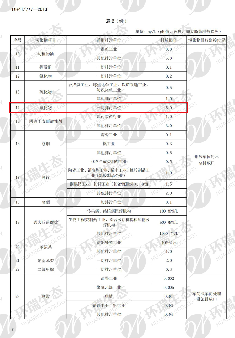 氟化物之河南《省轄海河流域水污染排放標準》DB41/777-013